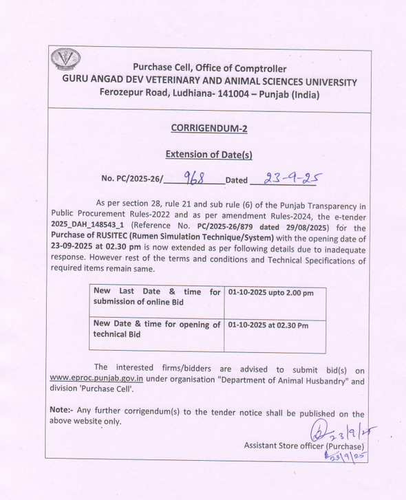 Corrigendum for Extension of dates of e tender for the purchase of RUSITEC (Rumen Simulation Technique/System), Accounts Officer,Purchase Cell O/o Comptroller,Guru Angad Dev Vety & Ani. Sci. Univ.,Ldh