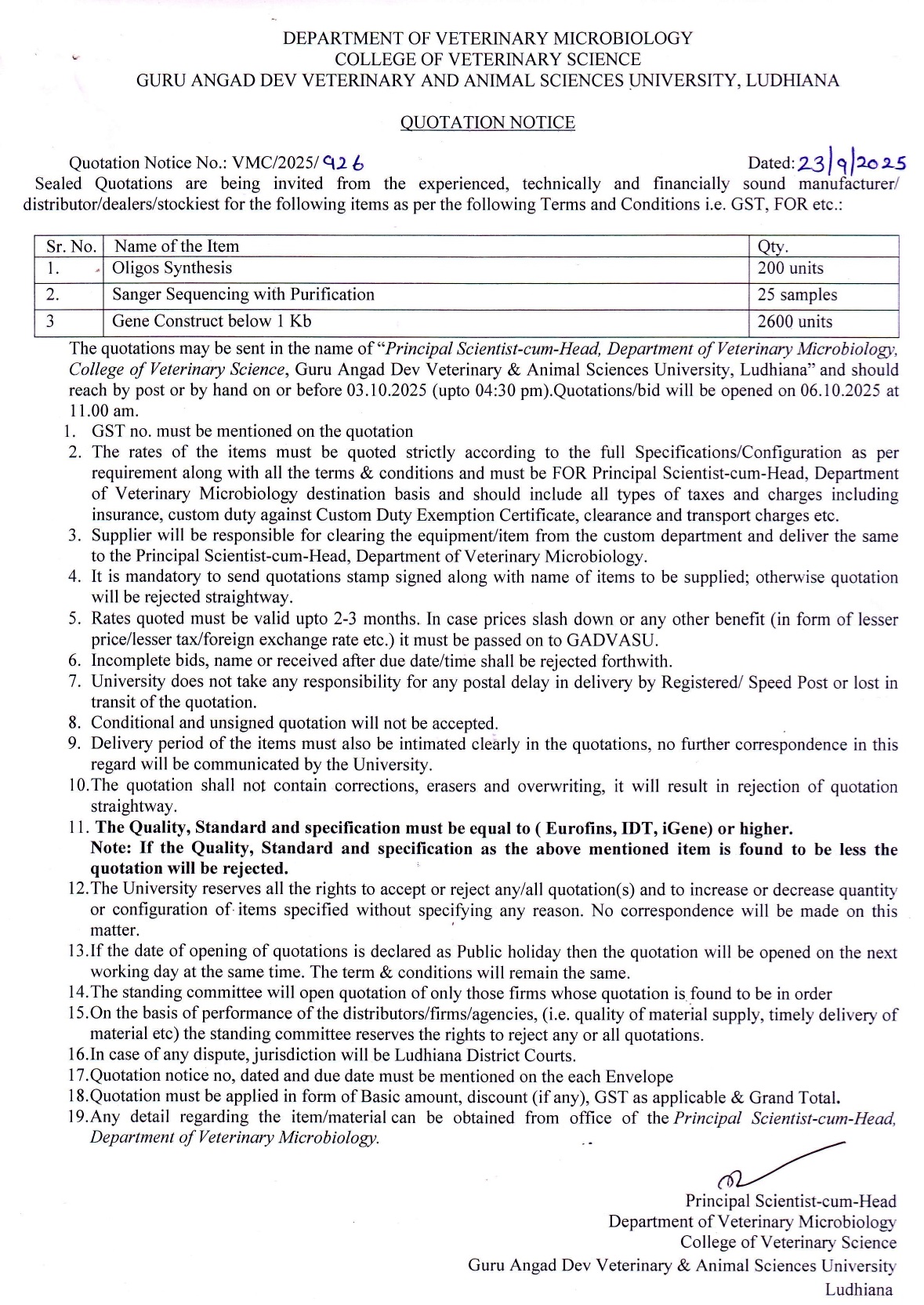 Quotation notice for the purchase of Primer Oligos, Sequencing & Gene Construct, Principal Scientist-cum-Head, Department of Veterinary Microbiology, GADVASU, Ludhiana