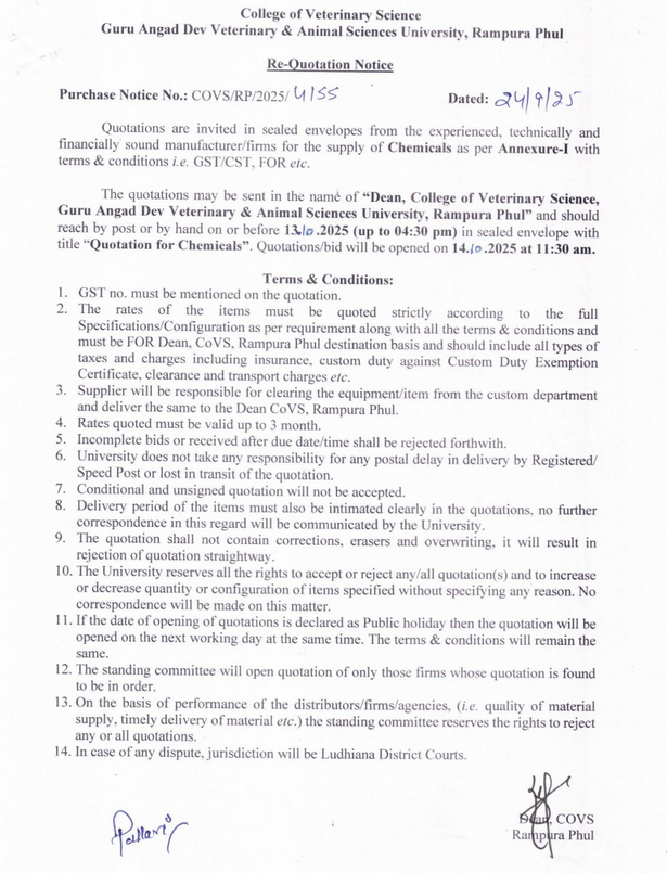 Re-Quotation Notice for the purchase of Chemicals for UG practical, Dean, College of Veterinary Science, Guru Angad Dev Veterinary & Animal Sciences University, Rampura Phul