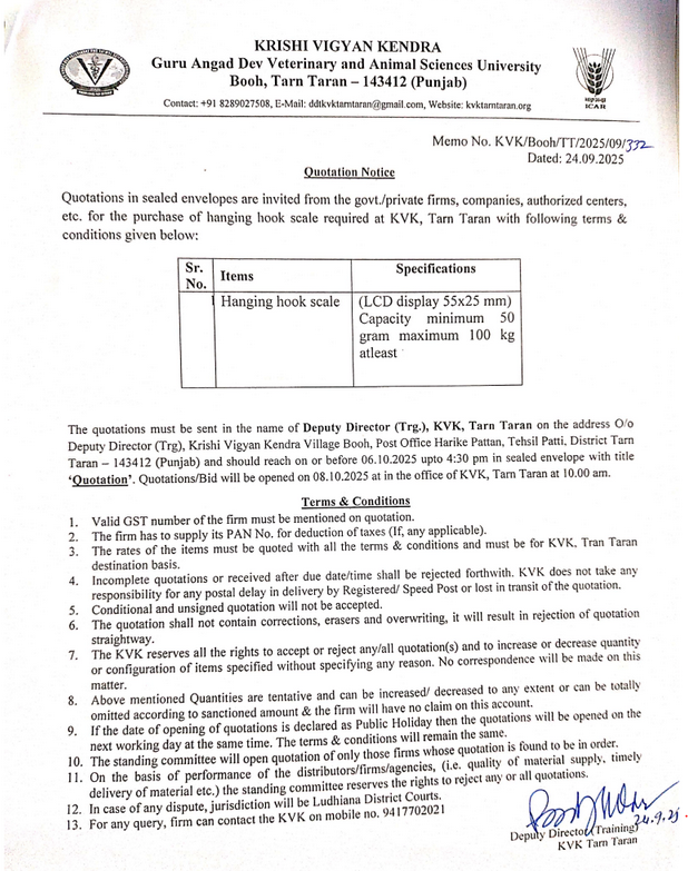 Quotation notice for the Hanging Hook Scale, Deputy Director (Training), Krishi Vigyan Kendra, GADVASU, Tarn Taran