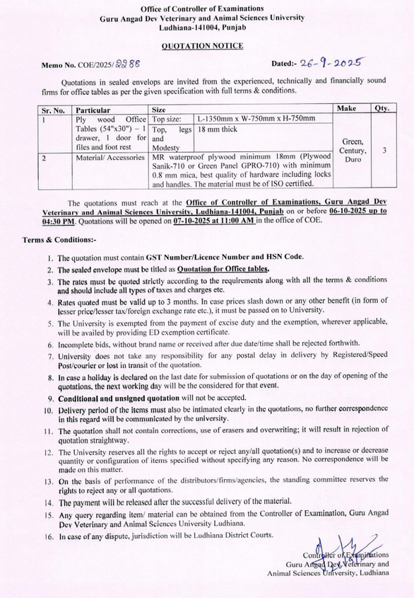 Quotation notice for office tables, O/o Controller of Examinations, Guru Angad Dev Veterinary and Animal Sciences University, Ludhiana