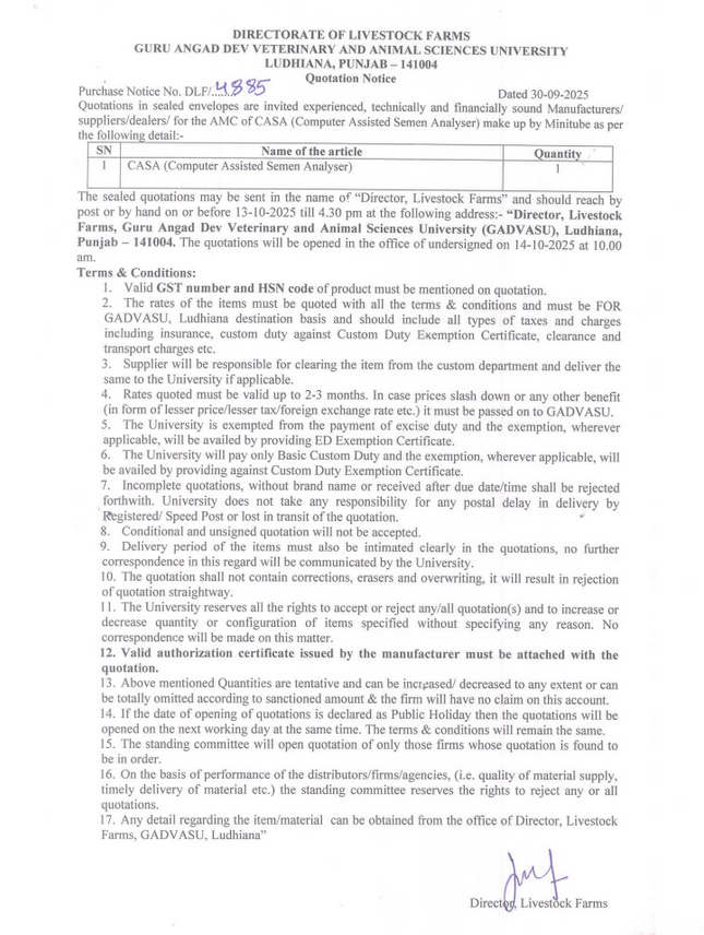 Quotation notice for AMC of CASA, Directorate of Livestock Farms, Guru Angad Dev Veterinary & Animal Sciences University, Ludhiana