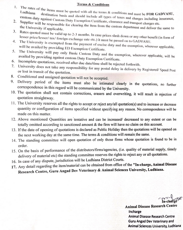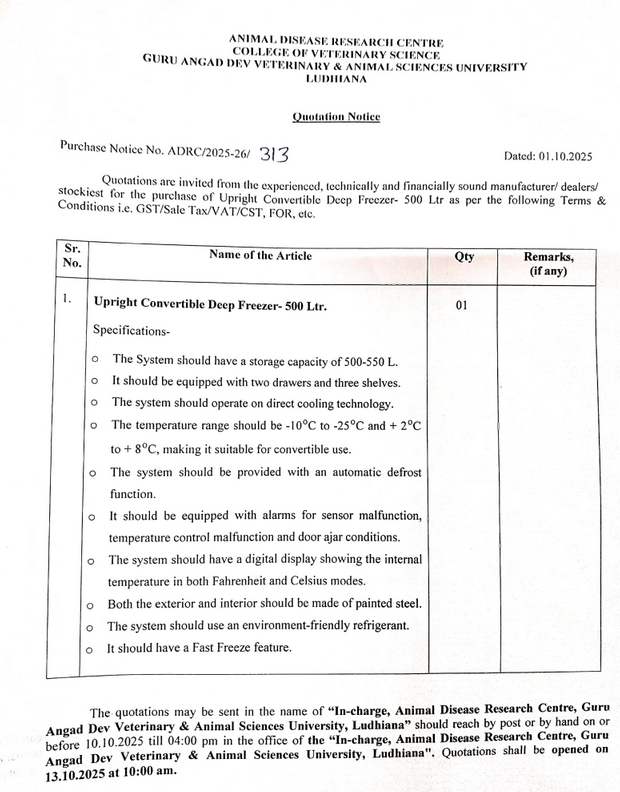 Quotation notice for the purchase of Upright convertible Deep freezer, In-charge, Animal Disease Research Centre, Guru Angad Dev Veterinary & Animal Sciences University, Ludhiana