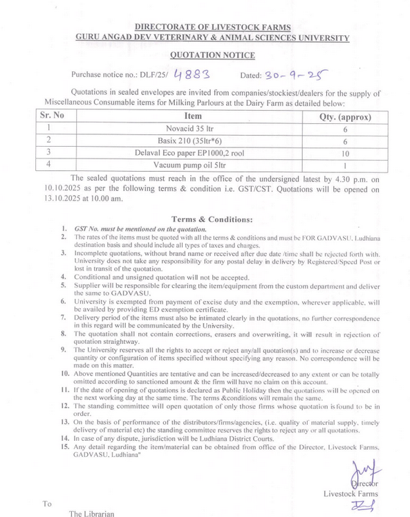 Quotation notice for the supply Misc. Consumable Items for Milking Parlours, Directorate of Livestock Farms, Guru Angad Dev Veterinary & Animal Sciences University, Ludhiana