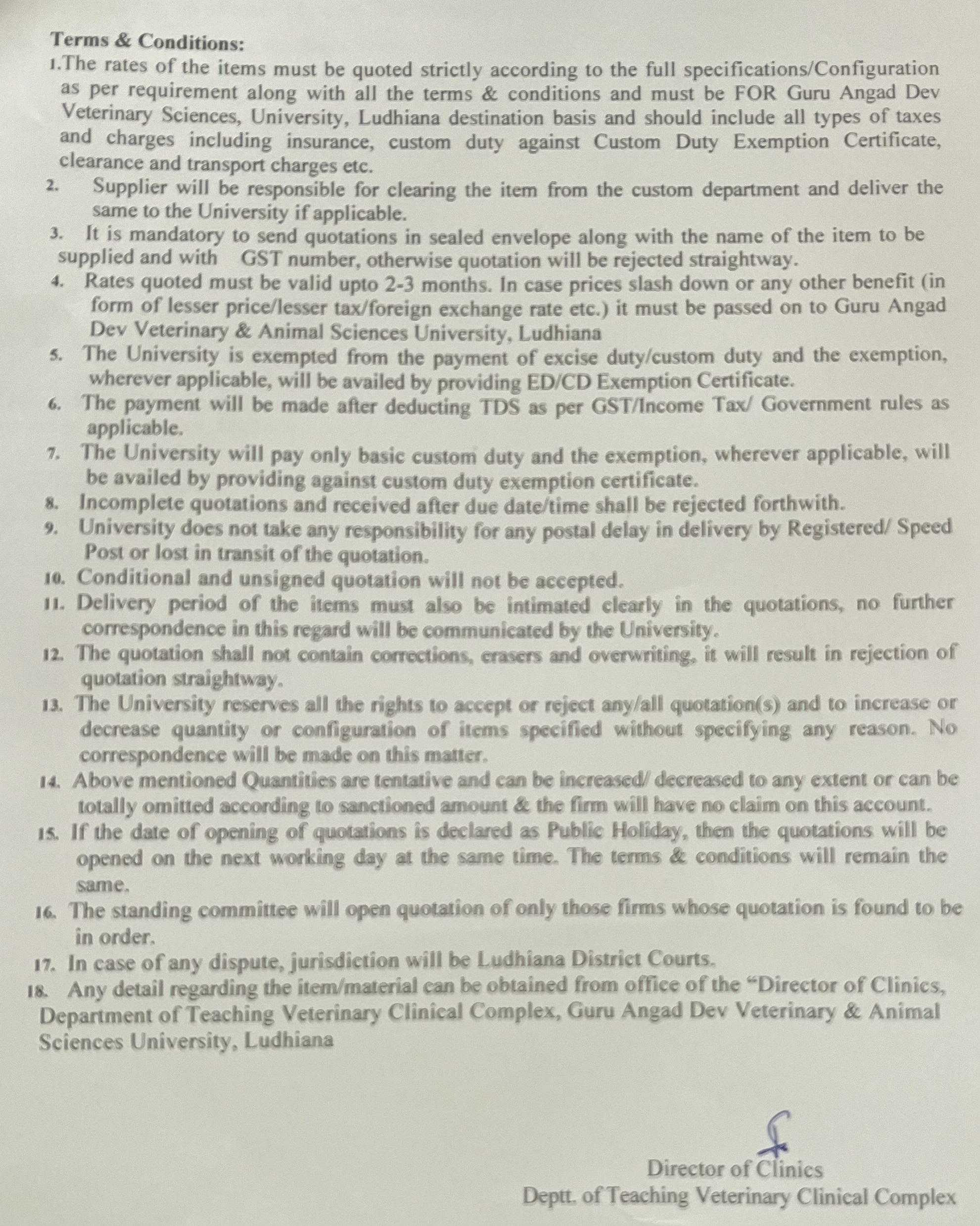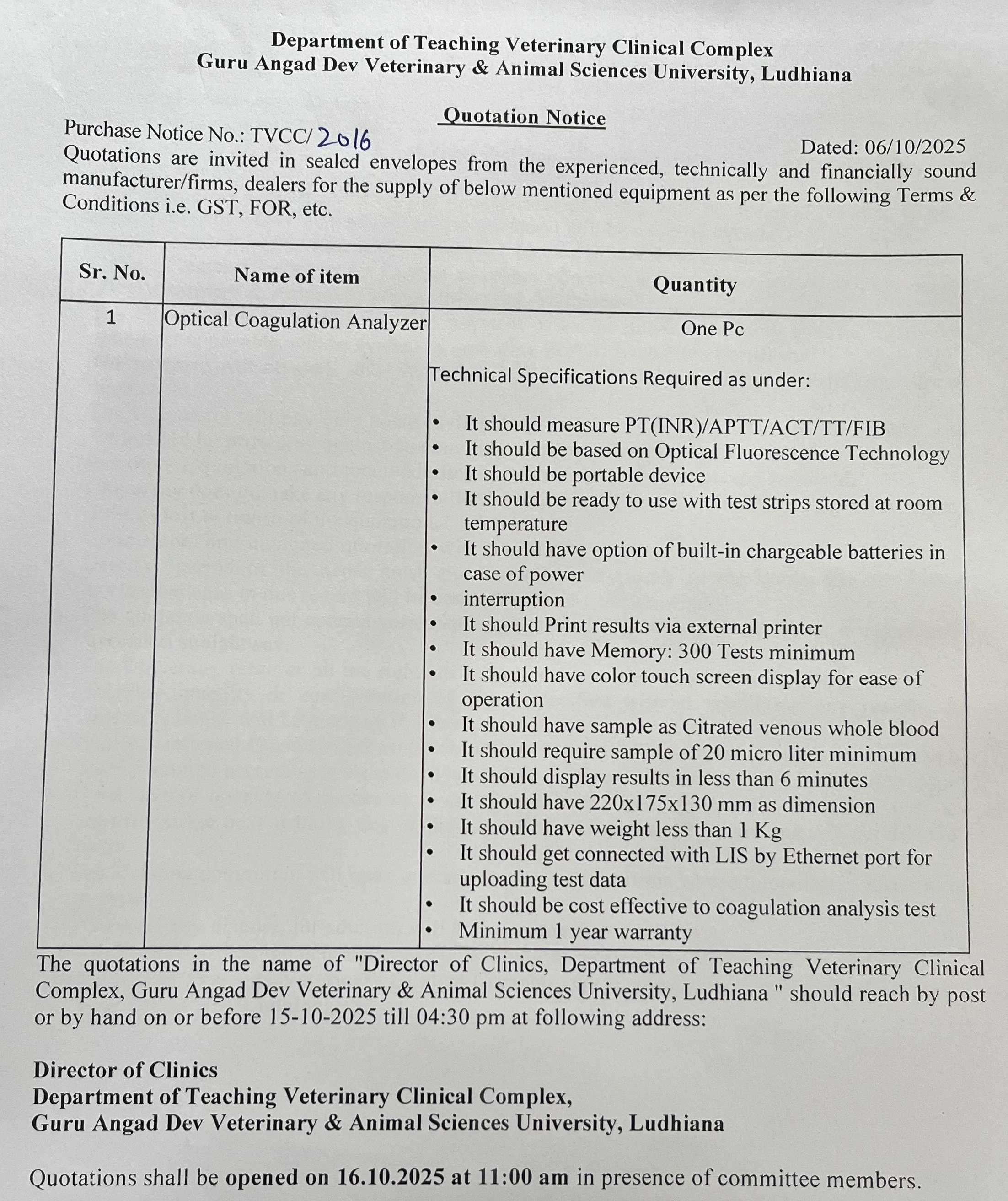 Quotation notice for the purchase of Optical Coagulation Analyzer, Director of Clinics, Department of Teachning Veterinary Clinical Complex, GADVASU, Ludhiana