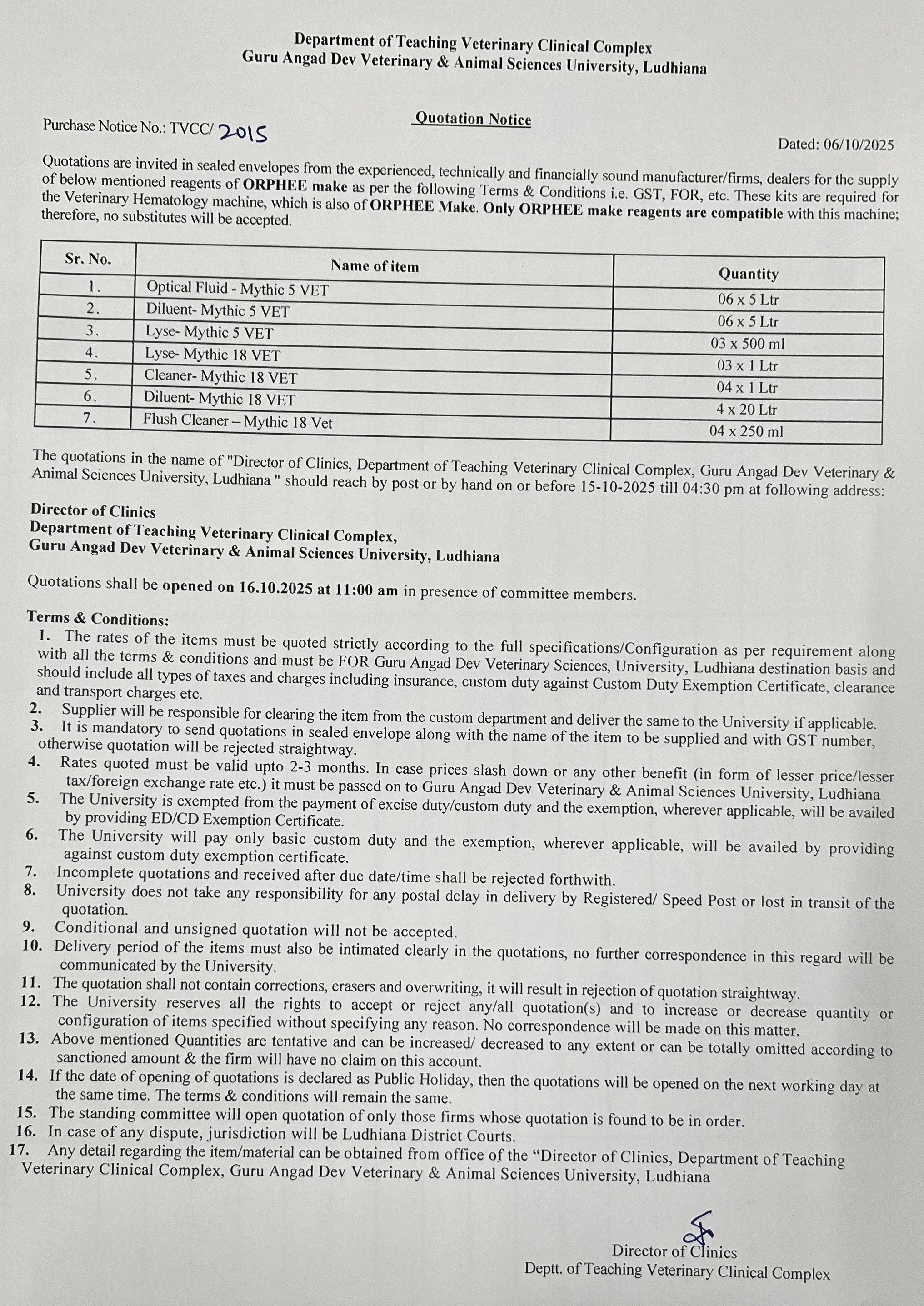 Quotation notice for the purchase of Reagents of ORPHEE Make, Director of Clinics, Department of Teachning Veterinary Clinical Complex, GADVASU, Ludhiana