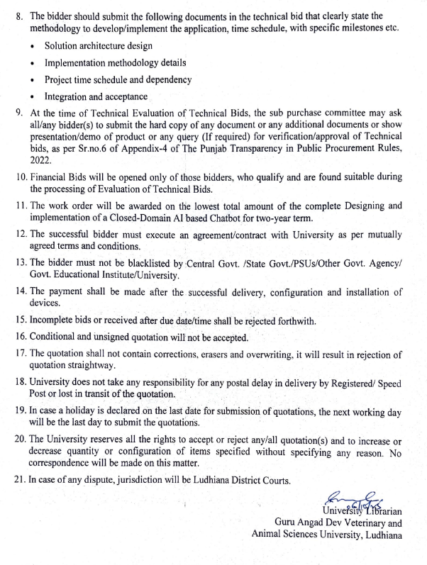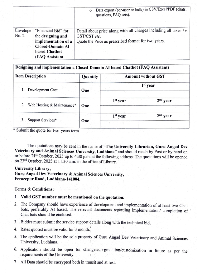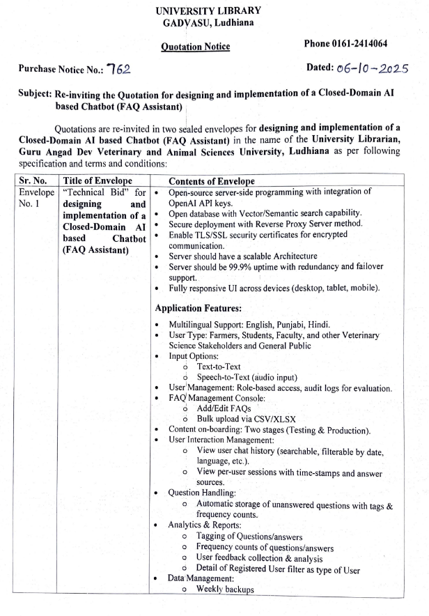 Re-inviting Quotation for designing and implementation of a Closed Domain AI based Chatbot, University Librarian, Guru Angad Dev Veterinary and Animal Sciences University, Ludhiana