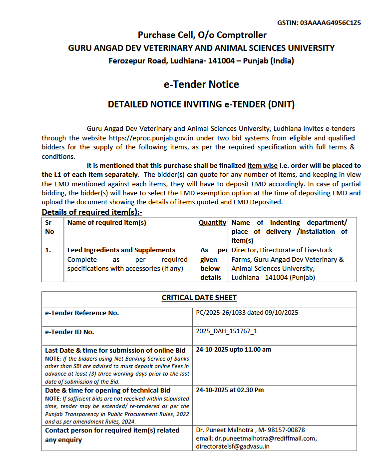 e-Tender for Feed Ingredients and Supplements, Assistant Store Officer, Purchase Cell O/o Comptroller, Guru Angad Dev Veterinary and Animal Sciences University, Ludhiana