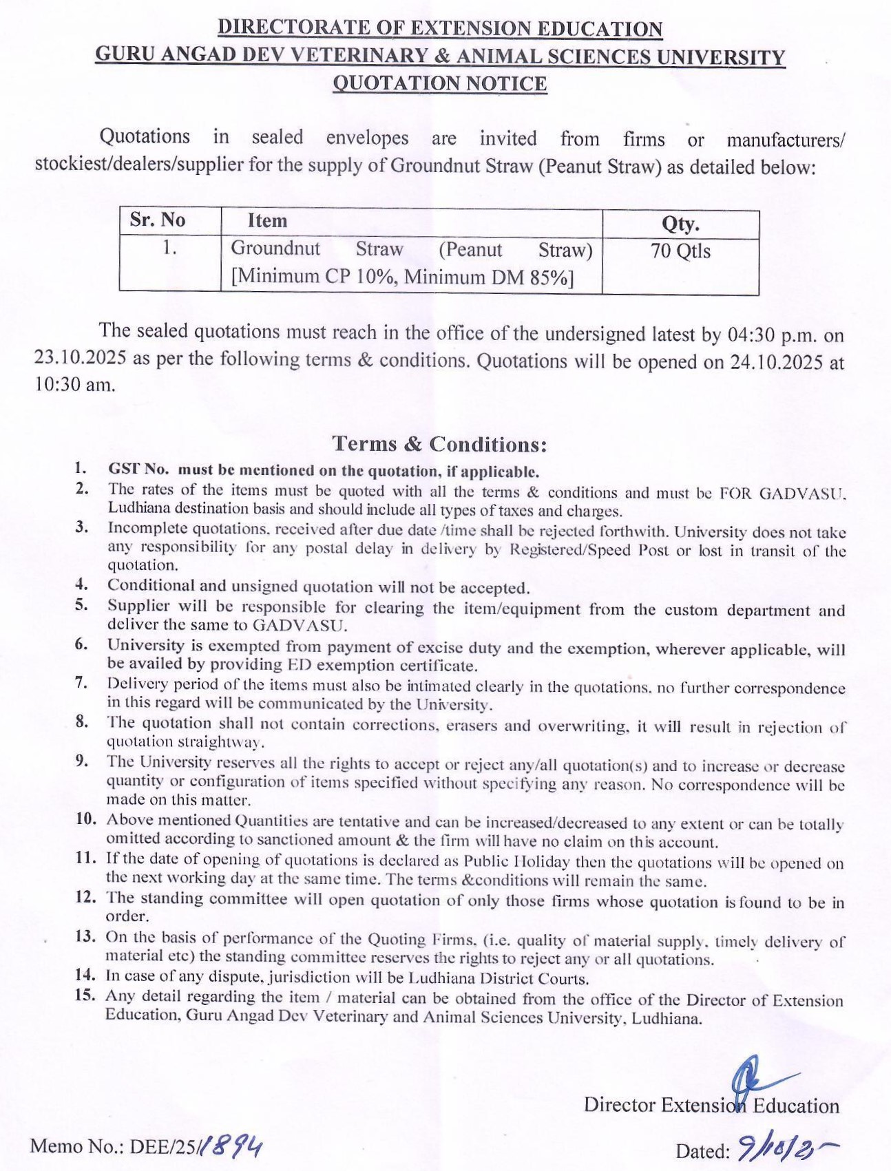 Quotation notice for the supply of Groundnut Straw (Peanut Straw), Directorate of Extension Education, Guru Angad Dev Veterinary and Animal Sciences, University, Ludhiana