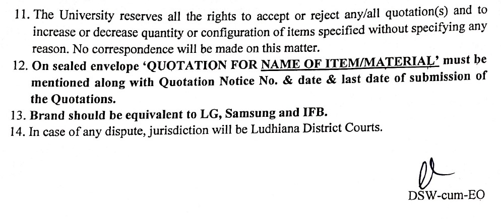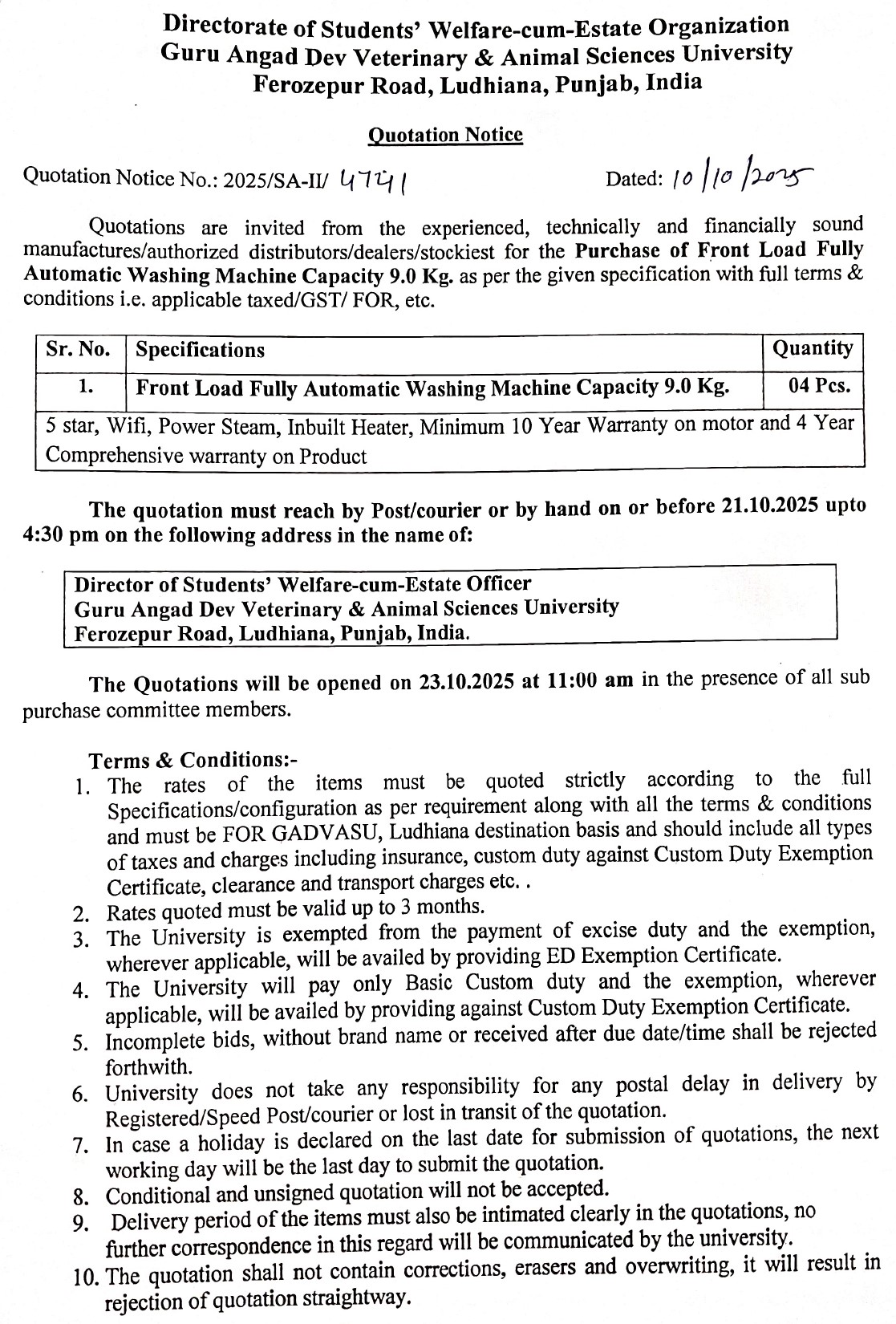 Quotation Notice for purchase of Front Load fully Automatic Washing Machine Capacity 9.00 kg, Directorate Of Students Welfare Cum Estate Organization, GADVASU, Ludhiana