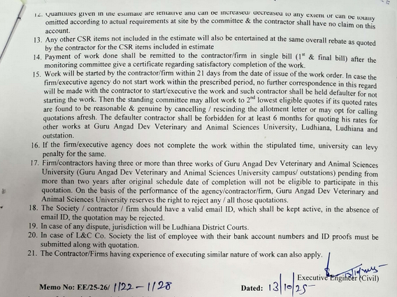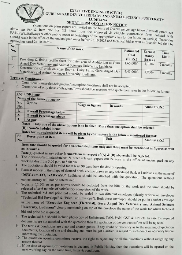 Short term quotation notice for Construction and profile sheet work, Executive Engineer (Civil), Guru Angad Dev Veterinary and Animal Sciences University, Ludhiana