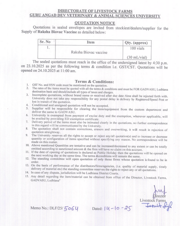 Quotation Notice for the supply of Raksha Biovac Vaccine, Director, Livestock Farms, Guru Angad Dev Veterinary & Animal Sciences University, Ludhiana