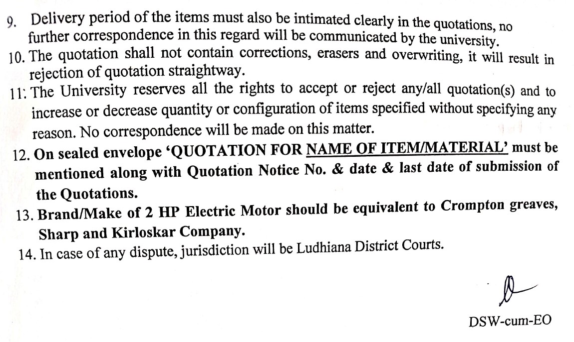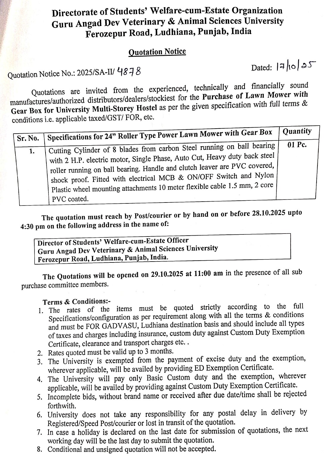Quotation Notice for the purchase of Lawn Mover with Gear Box, Directorate Of Students Welfare Cum Estate Organization, GADVASU, Ludhiana