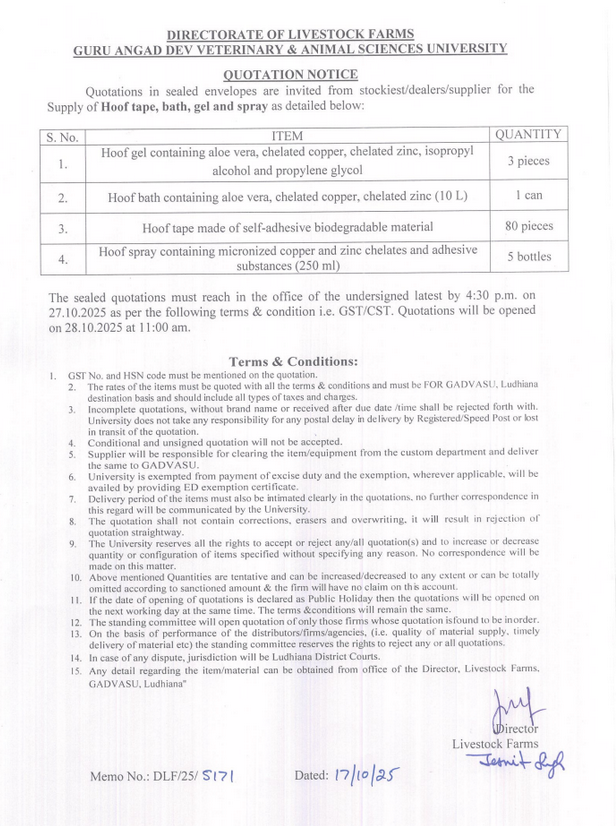 Quotation Notice for the Supply of Hoof Tape, Bath, gel and Spray, Director, Livestock Farms, Guru Angad Dev Veterinary & Animal Sciences University, Ludhiana