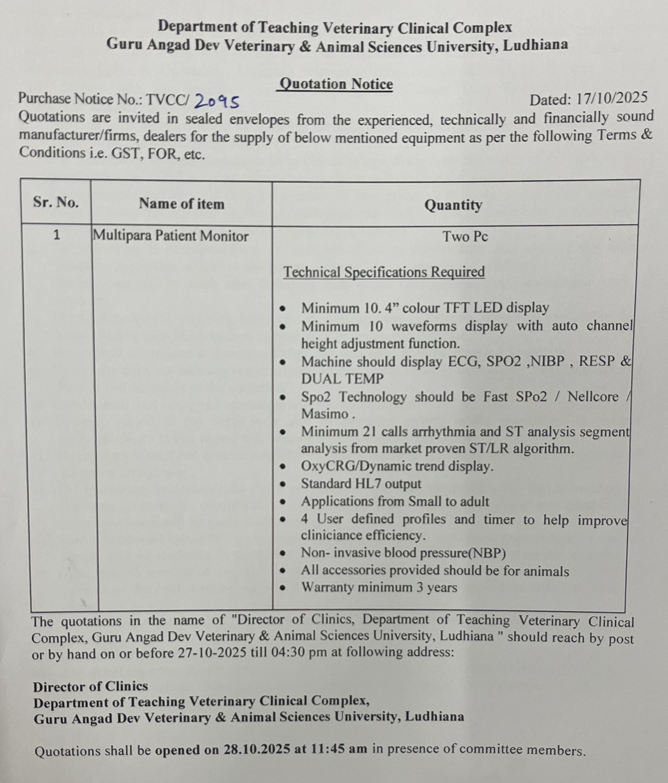 Quotation notice for the purchase of Multipara Patient Monitor, Director of Clinics, Department of Teaching Veterinary Clinical Complex, Guru Angad Dev Veterinary and Animal Sciences University, Ldh.