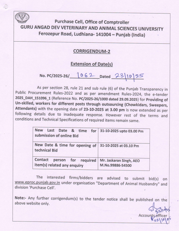 Corrigendum for Extension of dates of e tender for Providing of Un-skilled workers for different posts through outsourcing (Chowkidars,Sweepers,Attendants), Purchase Cell O/o Comptroller, GADVASU,Ldh