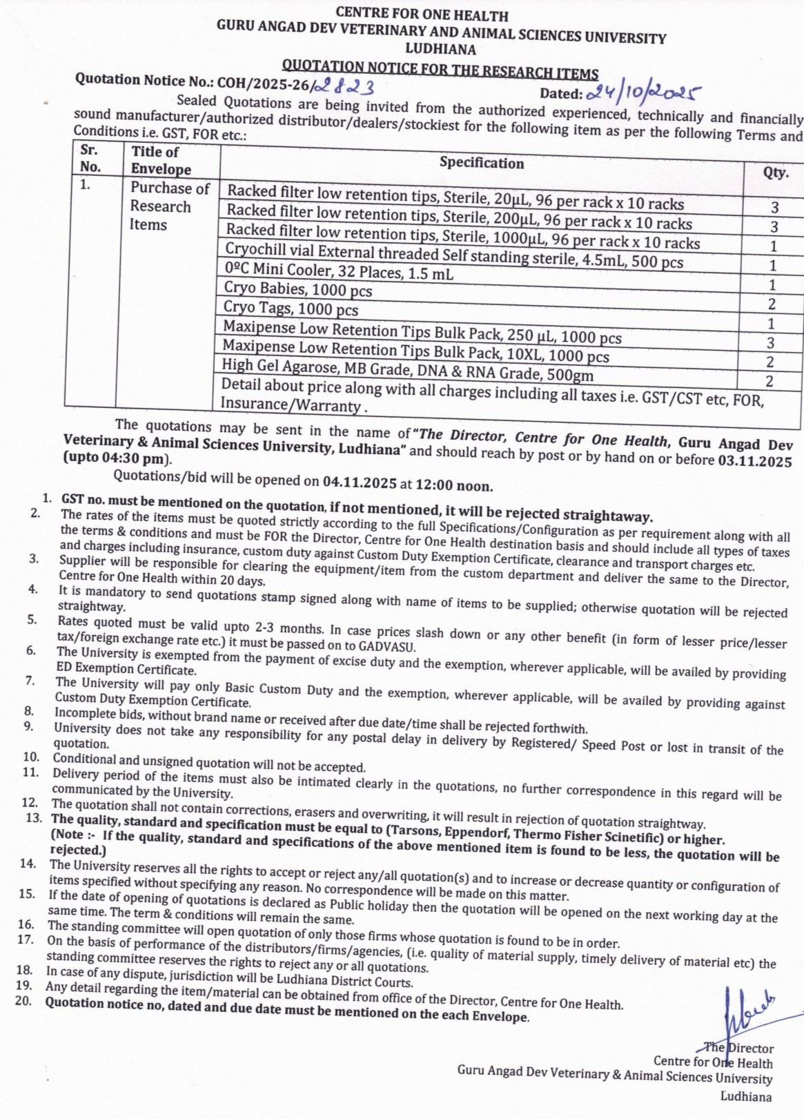Quotation Notice for the purchase of Research Items, The Director, Centre for One Health, Guru Angad Dev Veterinary & Animal Sciences University, Ludhiana