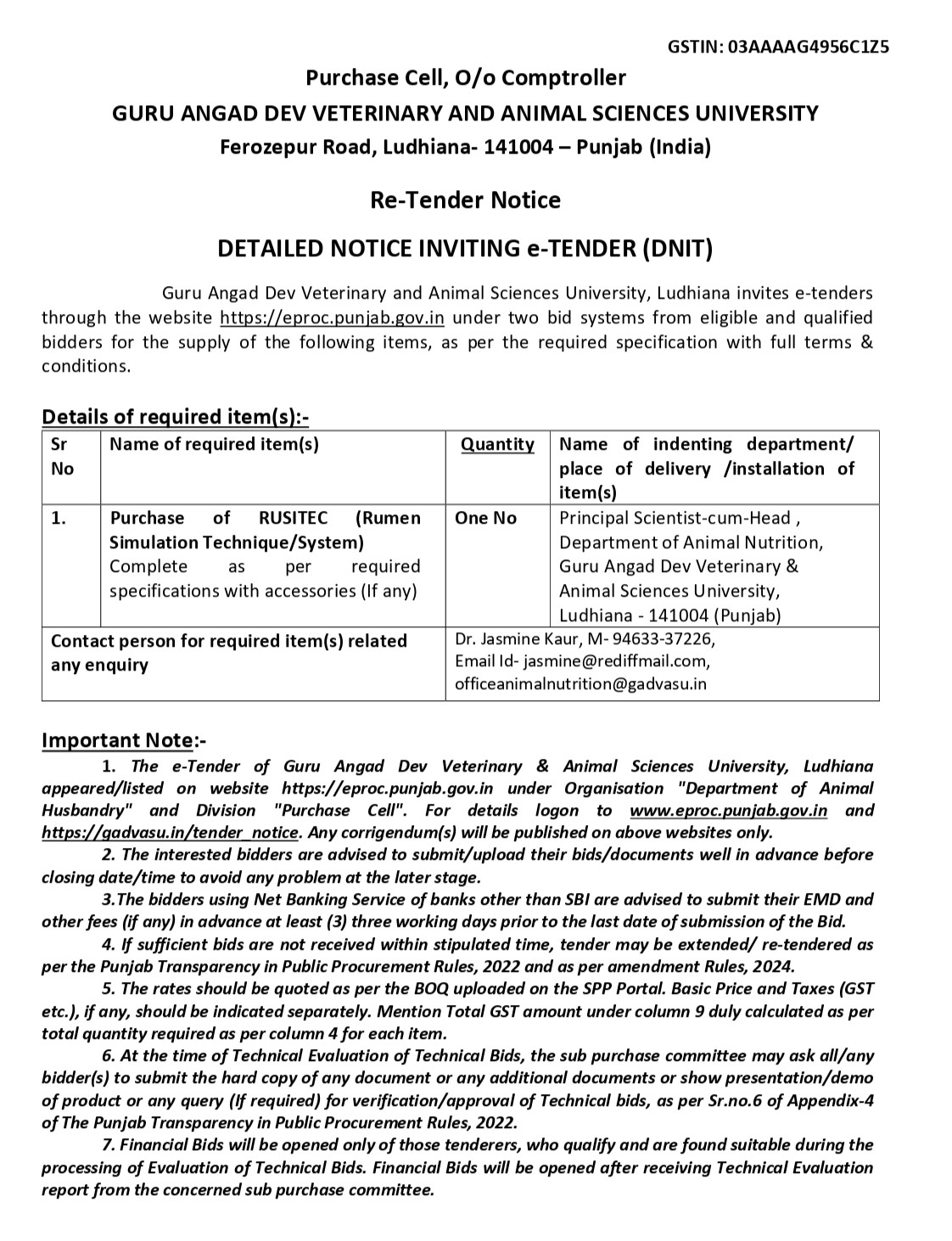 Re-Tender Notice for the purchase of Rusitec, Assistant Store Officer, Purchase Cell O/o Comptroller, Guru Angad Dev Veterinary and Animal Sciences University, Ludhiana