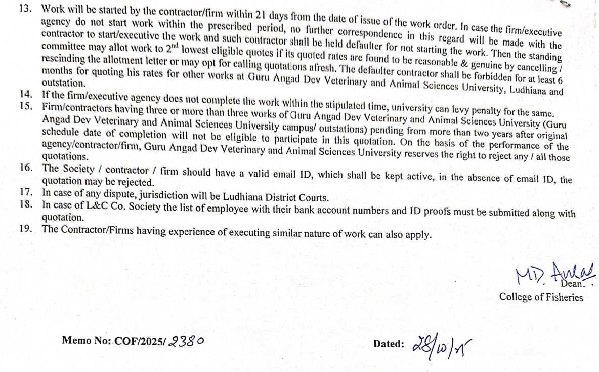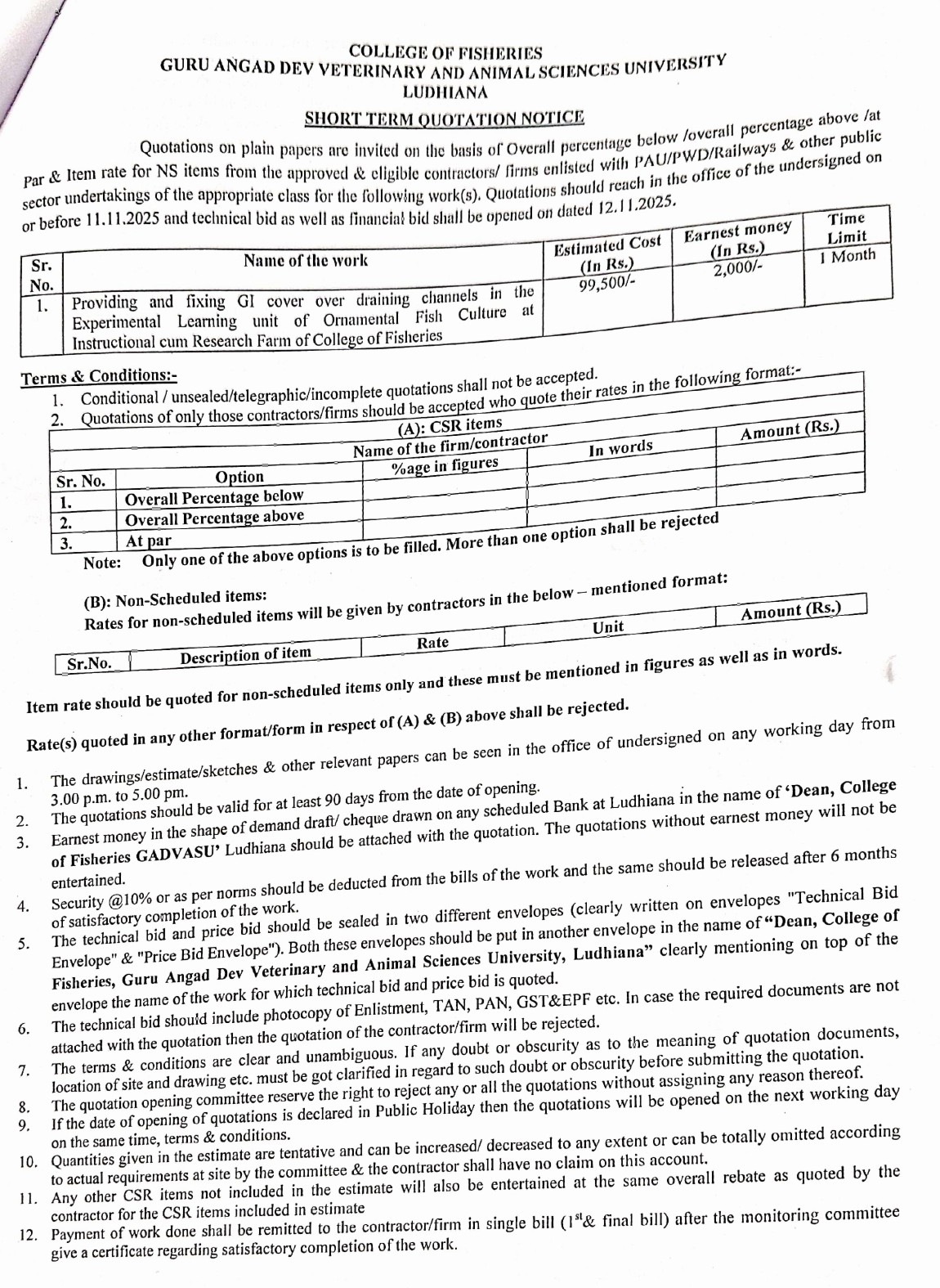 Short term Quotation Notice for Providing and fixing GI cover over draining channels in the Experimental Learning Unit, Dean, College of Fisheries, GADVASU, Ludhiana