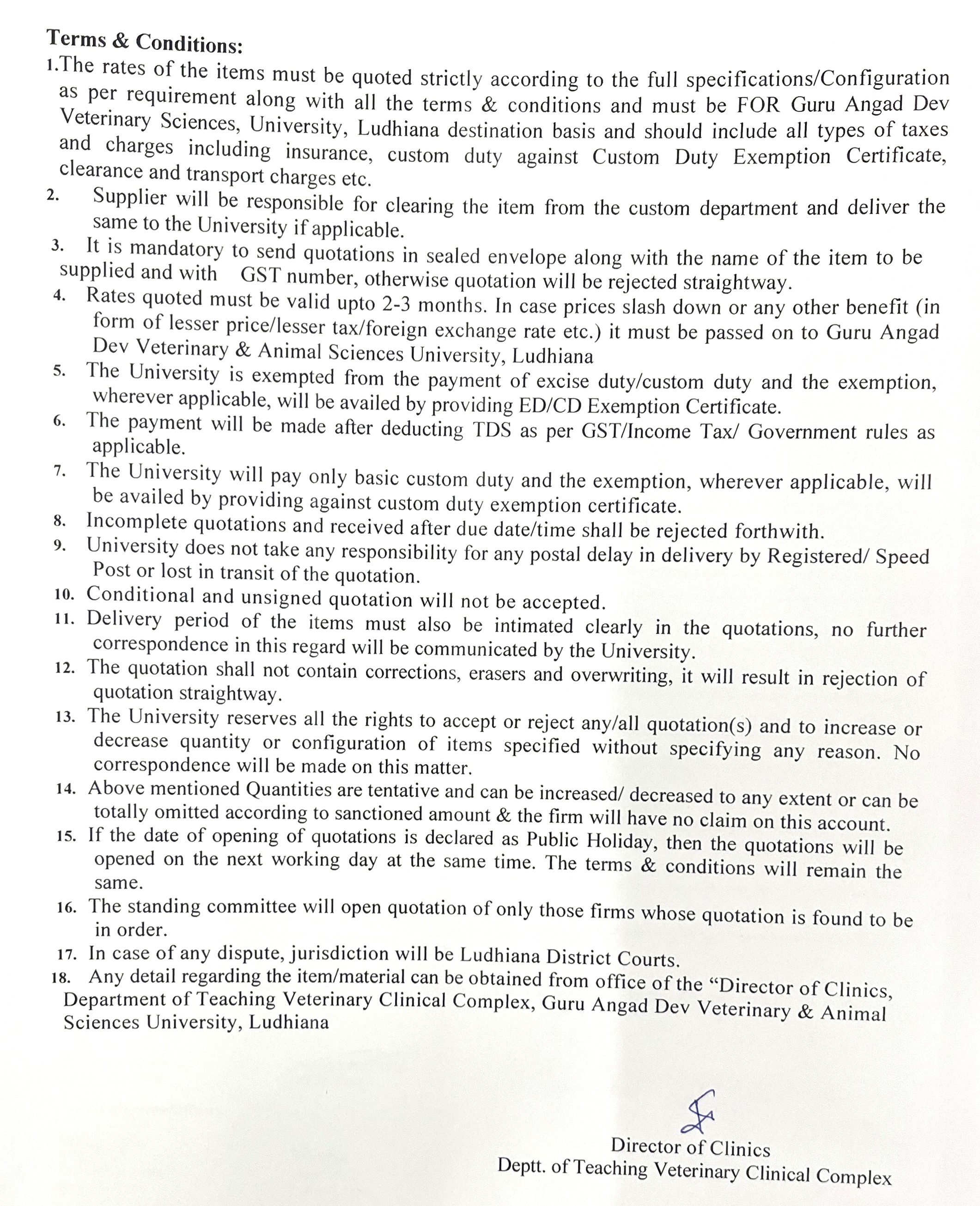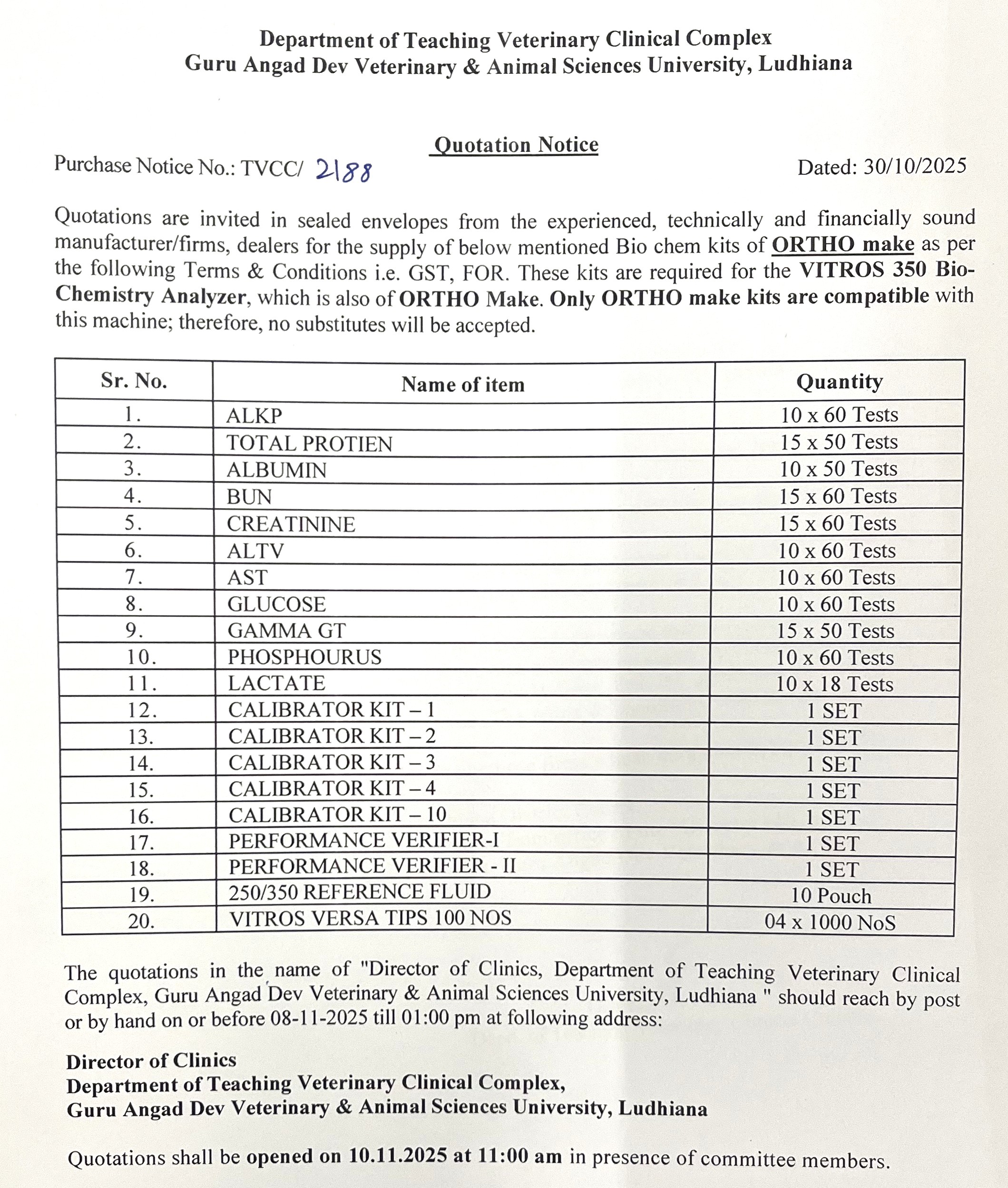 Quotation Notice for the supply of Bio chem kits of ORTHO make, Director of Clinics, Department of Teaching Veterinary Clinical Complex, Guru Angad Dev Veterinary & Animal Sciences University, Ldh