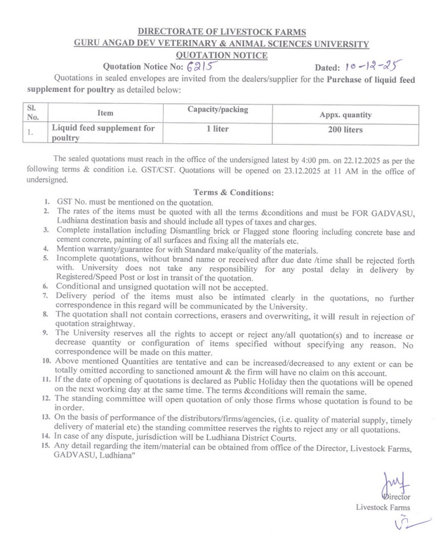 Quotation notice for the purchase of Liquid Feed supplement for poultry, Director, Livestock Farms, Guru Angad Dev Veterinary and Animal Sciences University, Ludhiana
