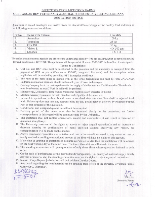 Quotation notice for the Poultry Feed Additives, Director, Livestock Farms, Guru Angad Dev Veterinary and Animal Sciences University, Ludhiana