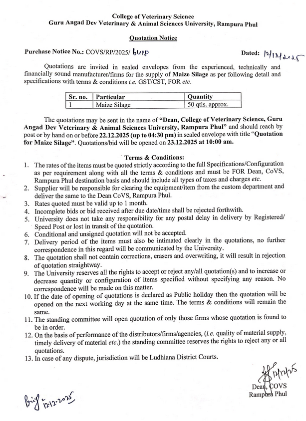 Quotation notice for the supply of Maize Silage, Dean, College of Veterinary Science, Guru Angad Dev Veterinary & Animal Sciences University, Rampura Phul
