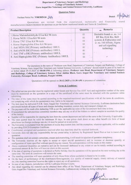 Quotation notice for the purchase of Elisa Kits & Antibodies, Department of Veterinary Surgery & Radiology, COVS, Guru Angad Dev Veterinary and Animal Sciences University, Ludhiana