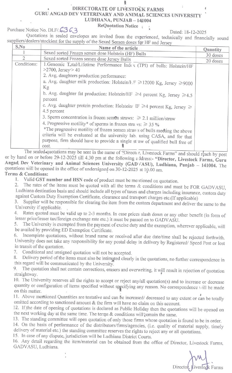 Quotation Notice for the supply of the Sexed Semen Doses for HF and Jersey, Director, Livestock Farms, Guru Angad Dev Veterinary & Animal Sciences University, Ludhiana