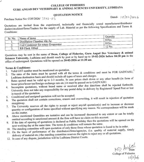 Quotation Notice for the supply of Lab. Material, Dean, College of Fisheries, Guru Angad Dev Veterinary & Animal Sciences University, Ludhiana