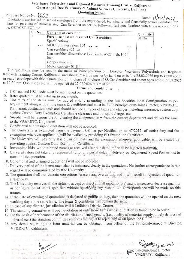 Quotation notice for purchase of Stainless Steel Can Scrubber, Principal-cum-Joint Director, Veterinary Polytechnic and Regional Research Training Centre, Kaljharani, GADVASU, Ludhiana