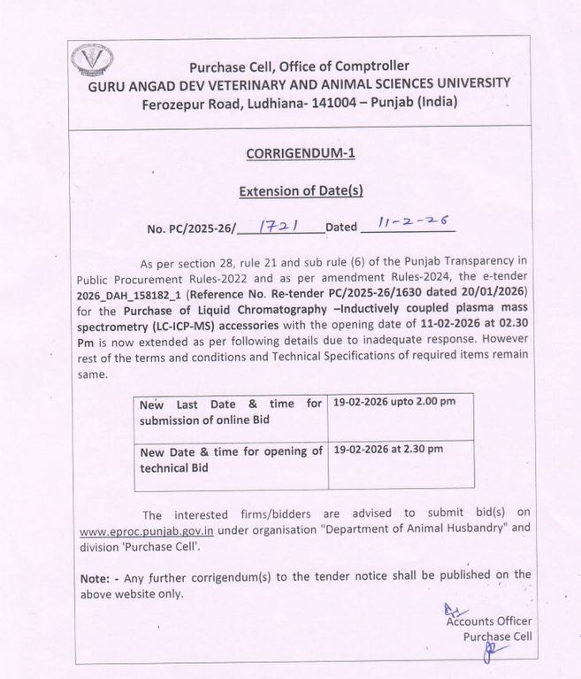 Corrigendum for Extension of dates of e tender for purchase of Liquid Chromatography–Inductively coupled plasma mass spectrometry accessories, Acc. Officer,Purchase Cell O/o Comptroller,GADVASU Ldh
