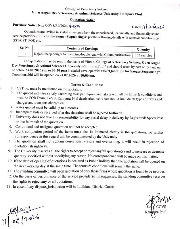 Quotations for the Sanger Sequencing, Dean, College of Veterinary Science, Guru Angad Dev Veterinary & Animal Sciences University, Rampura Phul