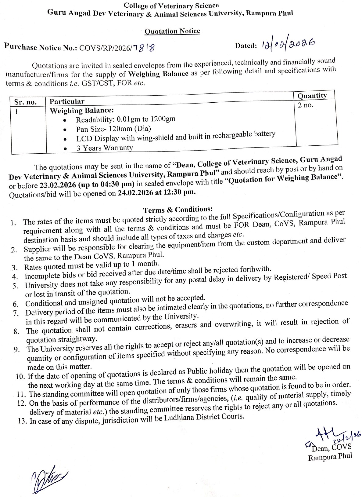 Quotation notice for the purchase of Weighing Balance, Dean, College of Veterinary Science, Guru Angad Dev Veterinary & Animal Sciences University, Rampura Phul