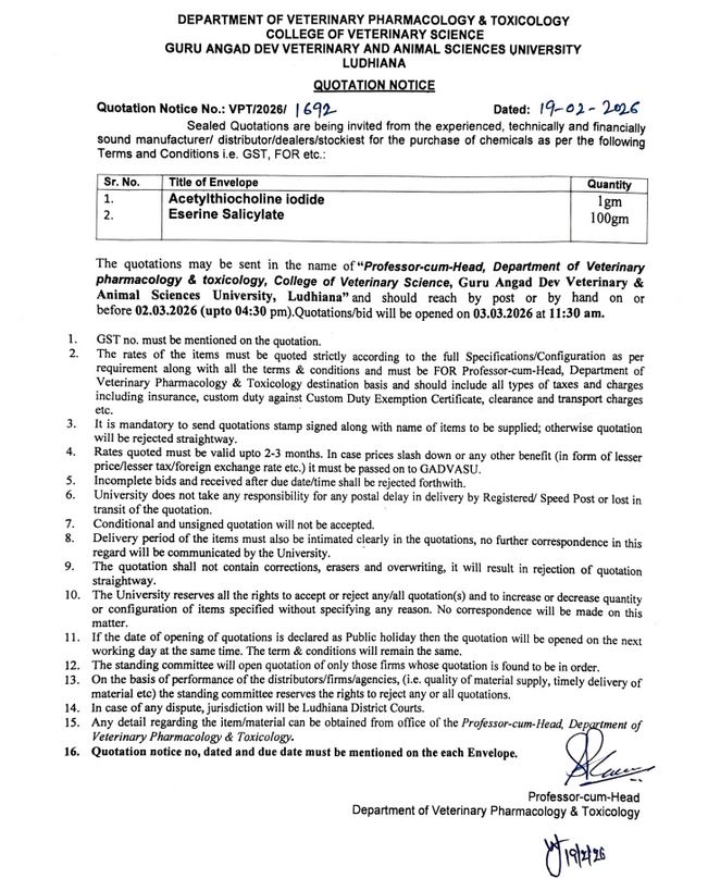 Quotation Notice for the purchase of Chemicals, Professor cum Head, Department of Veterinary Pharmacology & Toxicology, COVS, Guru Angad Dev Veterinary & Animal Sciences University, Ludhiana