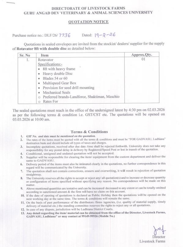 Quotation Notice for the supply of Rotavator 8ft with double disc, Director, Livestock Farms, Guru Angad Dev Veterinary and Animal Sciences University, Ludhiana