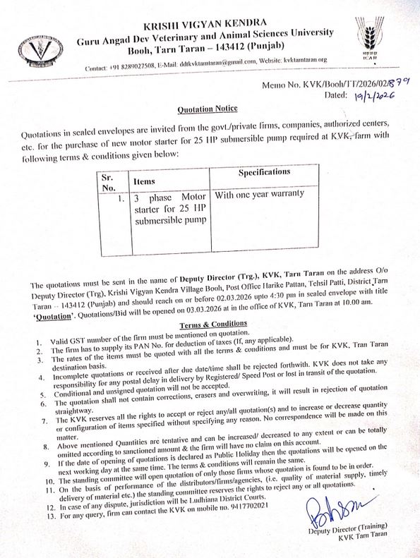 Quotation notice for purchase of 3 phase motor starter for 25 HP submersible pump, Deputy Director (Trg.), Krishi Vigyan Kendra, Booh, Tarn Taran, GADVASU, Ludhiana