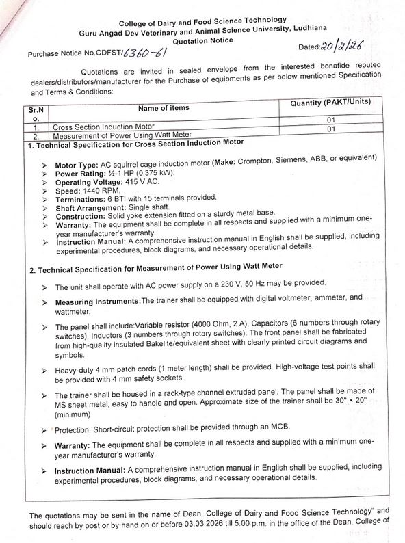 Quotation notice for purchase of Lab equipment, Dean, College of Dairy & Food Science Technology, Guru Angad Dev Veterinary & Animal Sciences University, Ludhiana