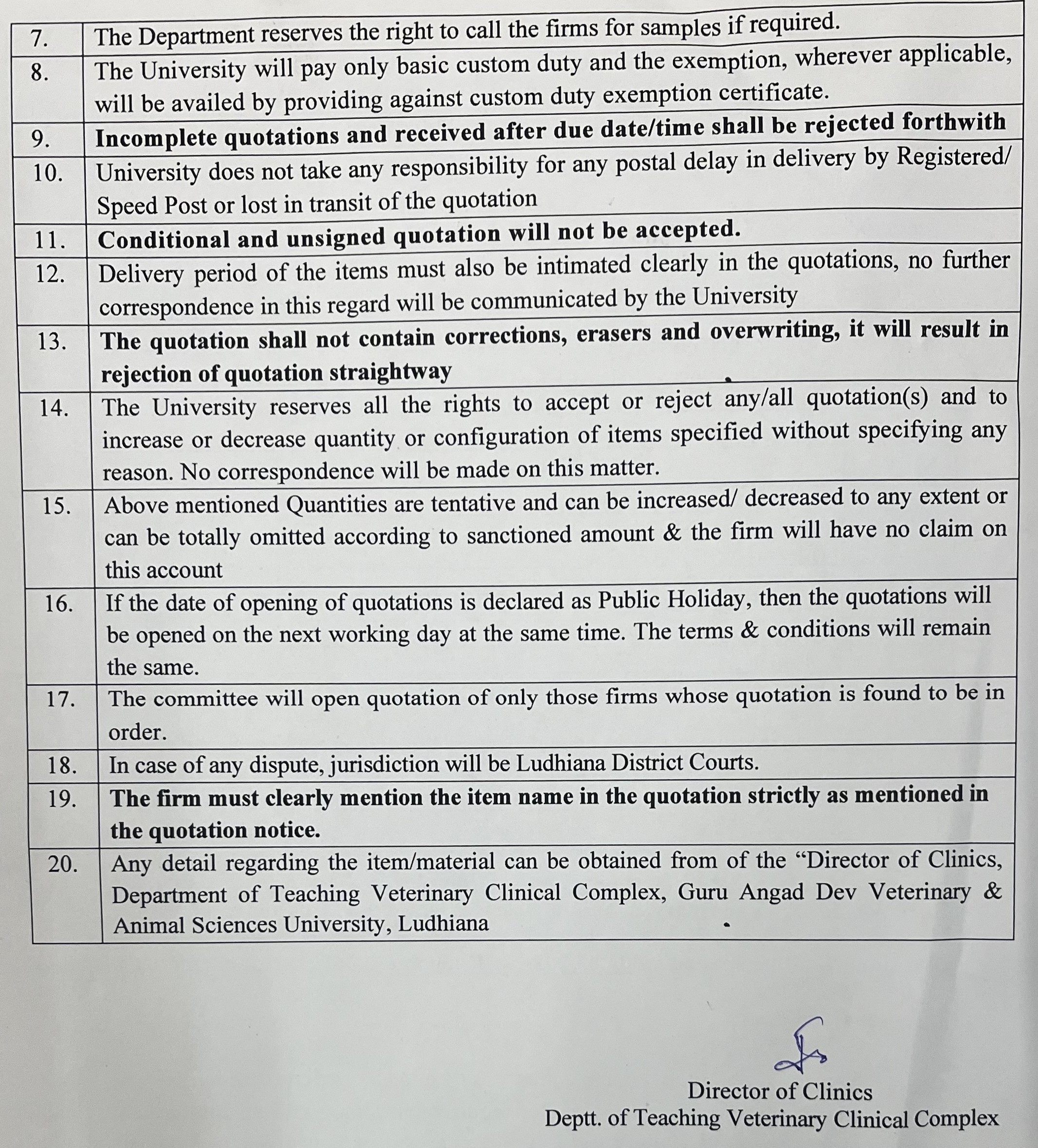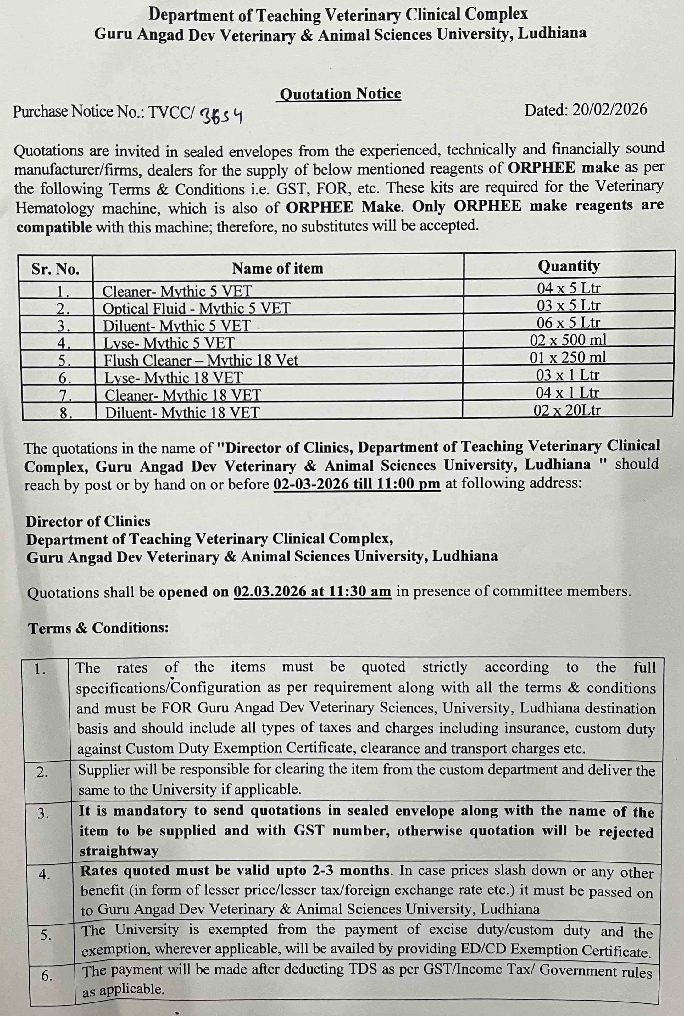 Quotation notice for the purchase of ORPHEE make reagents, Director of Clinics, Deptt. of Teaching Veterinary Clinical Complex, GADVASU, Ludhiana