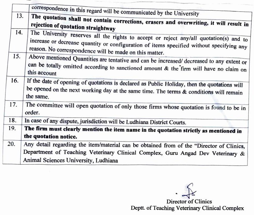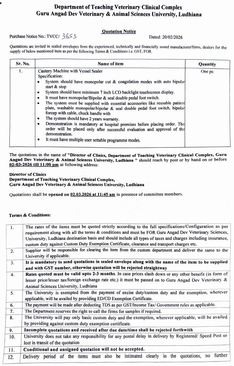 Quotation notice for the purchase of Cautery Machine with Vessel Sealer, Director of Clinics, Deptt. of Teaching Veterinary Clinical Complex, GADVASU, Ludhiana