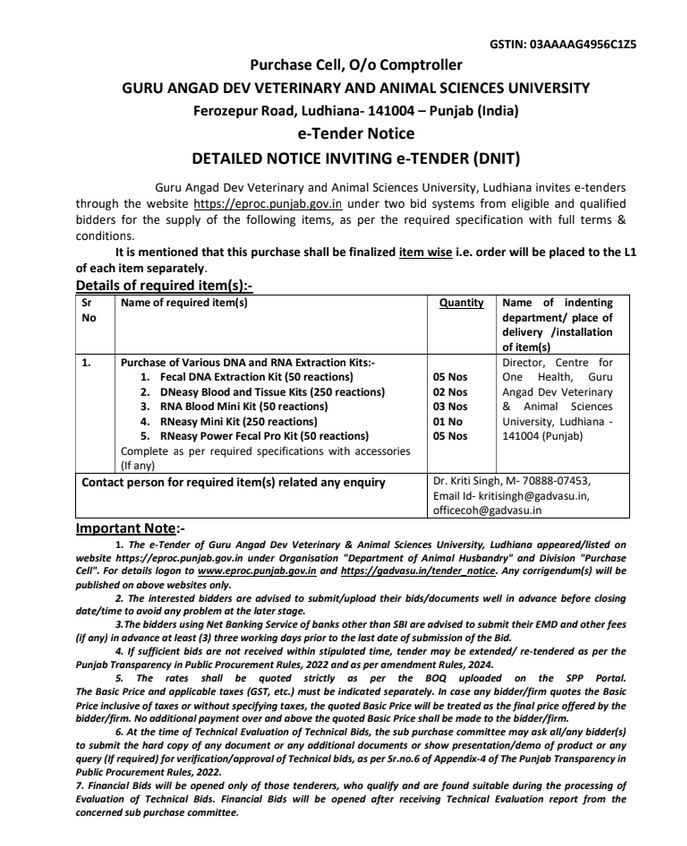 e -Tender notice for the Purchase of Various DNA and RNA Extraction Kits, Assistant Store Officer,Purchase Cell, O/o Comptroller, Guru Angad Dev Veterinary & Animal Sciences University, Ludhiana