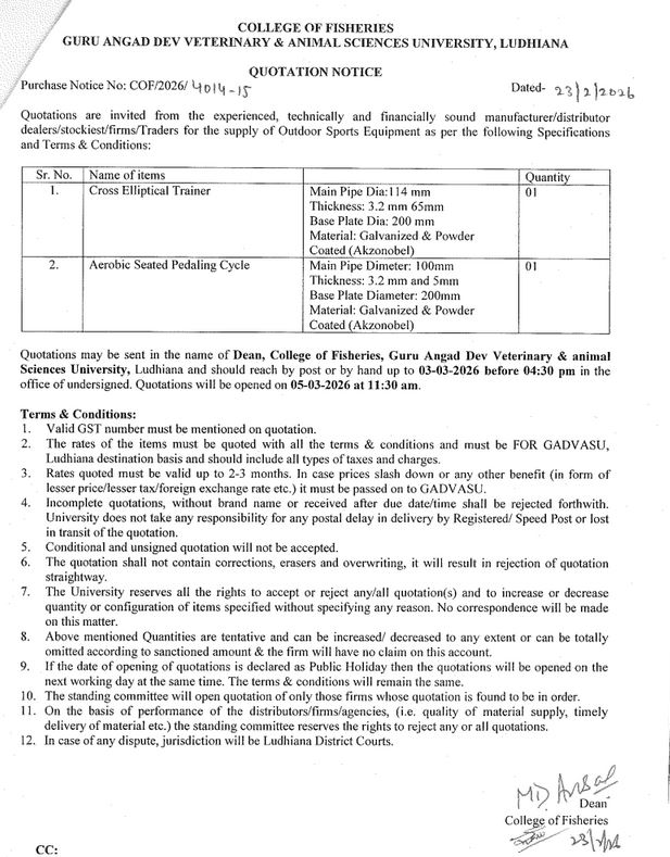 Quotation notice for the supply of Outdoor Sports Equipment, Dean, College of Fisheries, Guru Angad Dev Veterinary & Animal Sciences University, Ludhiana
