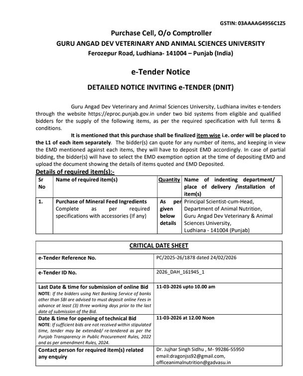 e -Tender notice for the Purchase of Mineral Feed Ingredients, Assistant Store Officer, Purchase Cell O/o Comptroller, Guru Angad Dev Veterinary and Animal Sciences University, Ludhiana