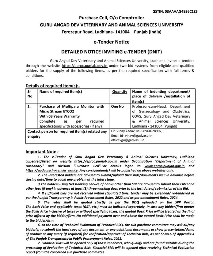 e -Tender notice for the Purchase of Multipara Monitor with Micro Stream ETCO2, Assistant Store Officer, Purchase Cell O/o Comptroller, Guru Angad Dev Veterinary and Animal Sciences University, Ldh