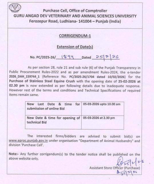 Corrigendum for Extension of dates of e tender for the purchase of Stainless Steel Equine Crush, Assistant Store Officer, Purchase Cell O/o Comptroller, GADVASU, Ludhiana