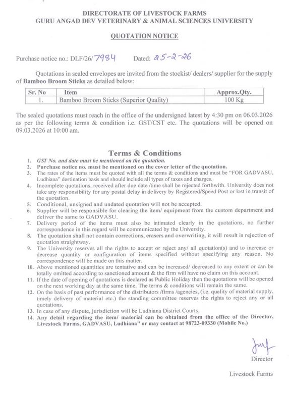 Quotation Notice for the supply of Bamboo Broom Sticks, Director, Livestock Farms, Guru Angad Dev Veterinary and Animal Sciences University, Ludhiana