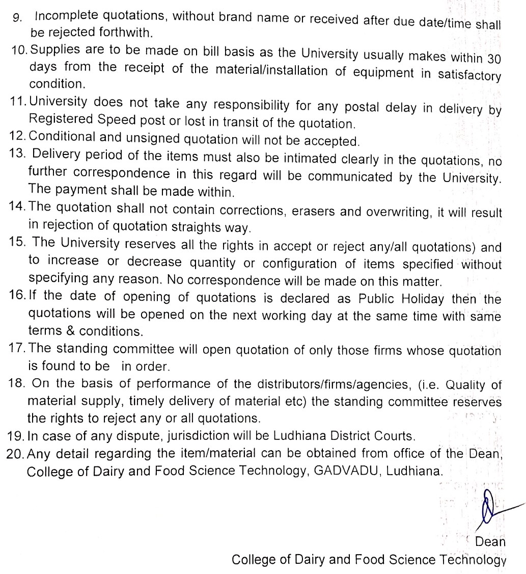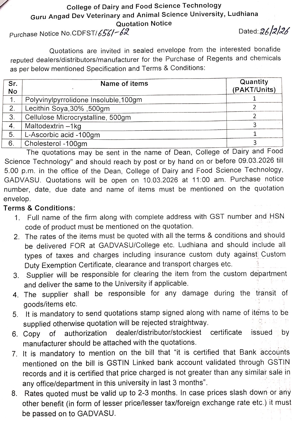 Quotation notice for the purchase of Regents and Chemicals, Dean, College of Dairy & Food Science Technology, Guru Angad Dev Veterinary & Animal Sciences University, Ludhiana