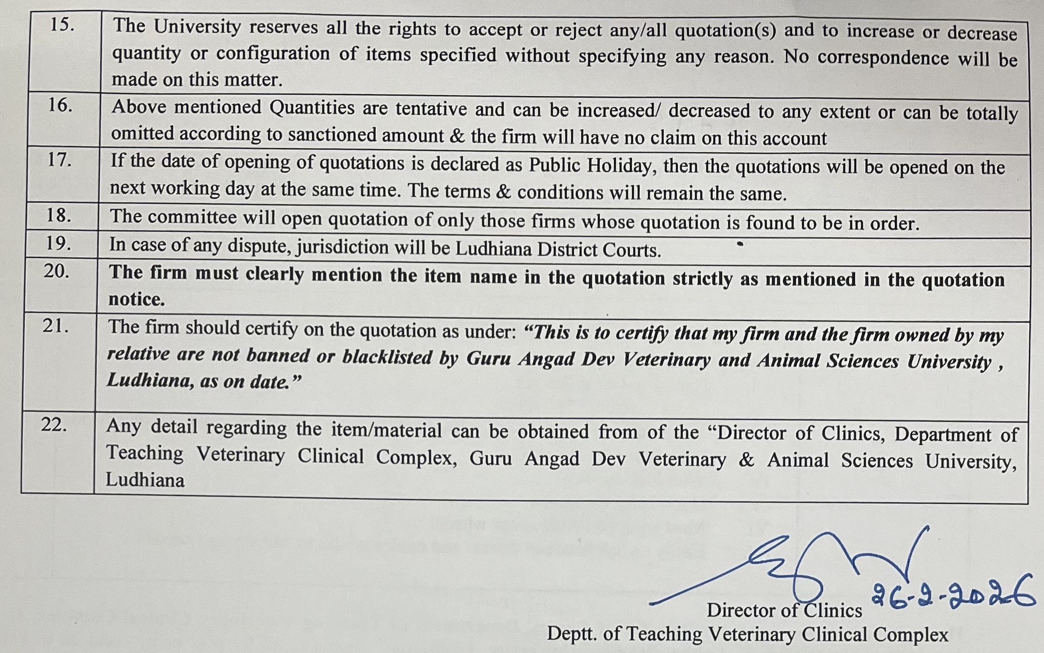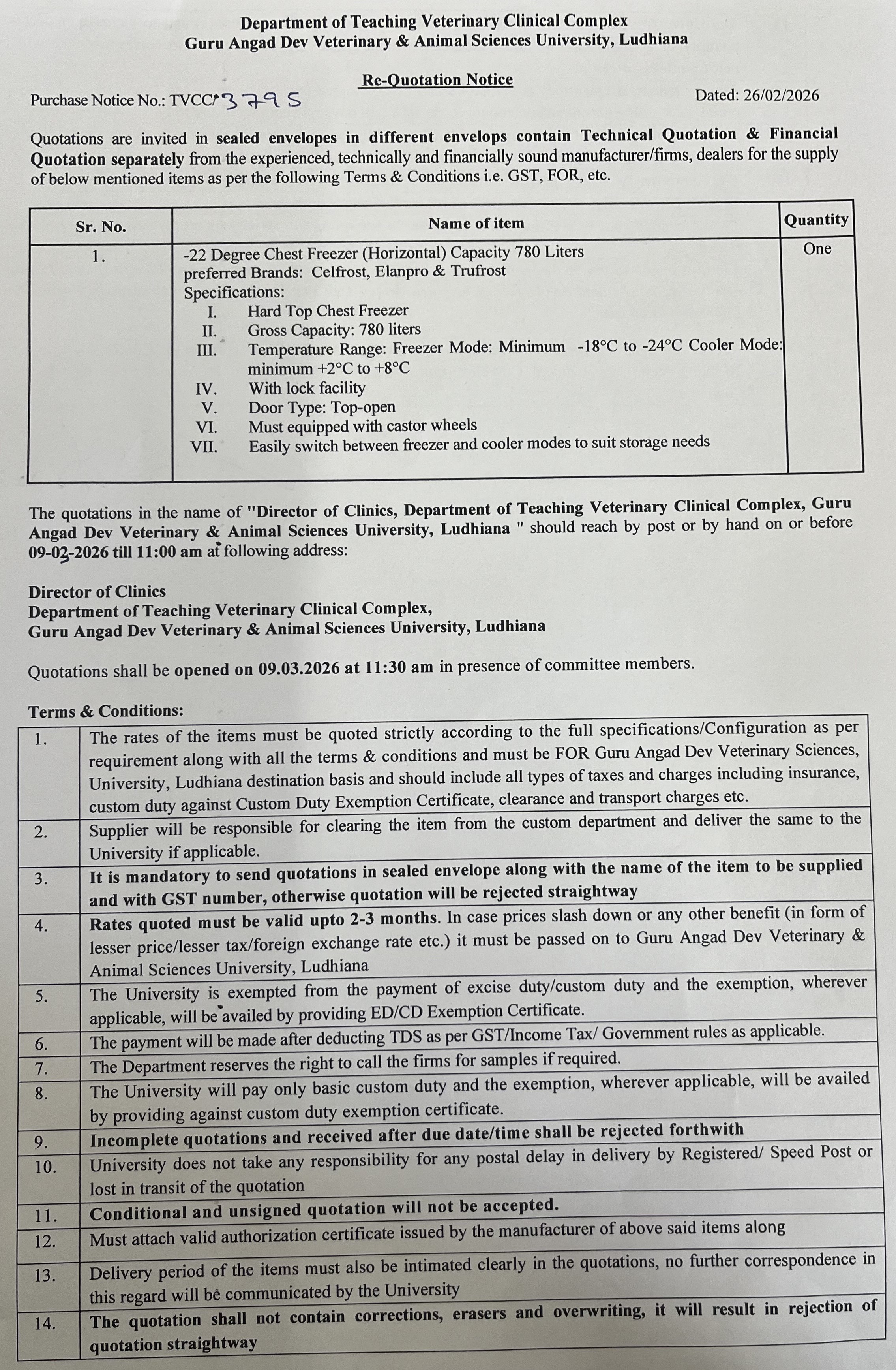 Re- Quotation Notice for the supply of -22 Degree Chest Freezer, Director of Clinics, Department of Teaching Veterinary Clinical Complex, Guru Angad Dev Veterinary & Animal Sciences University, Ludhia
