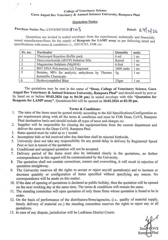 Quotations for the purchase of Reagents for LAMP assay, Dean, College of Veterinary Science, Guru Angad Dev Veterinary & Animal Sciences University, Rampura Phul