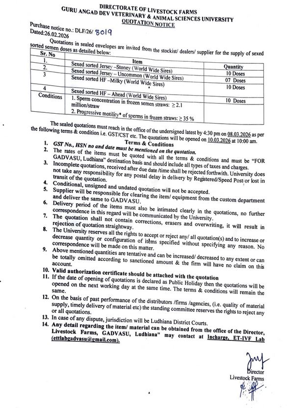 Quotation Notice for the supply of the Sexed Semen doses, Director, Livestock Farms, Guru Angad Dev Veterinary & Animal Sciences University, Ludhiana